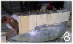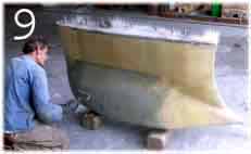 9-10. Setzen Sie z. 3 Lagen glasfaserverstärktes Polyester auf dem Kiel und ganz nach unten auf den Vorlauf. Dann glätten und schleifen, bis der Kiel fertig ist, bevor er von unten gestrichen wird.